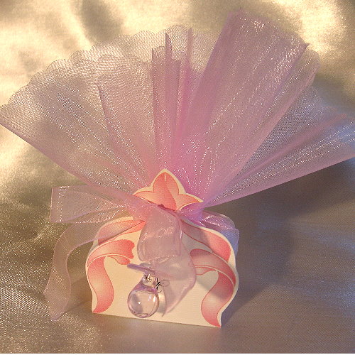 Marturie realizata dintr-un manson de carton crem mat striat cu tipar in nuante de roz, cuprinde 5 arahide glazurate prinse intr-un cerc de organza roz, o fundita asortata si un biberon de plastic transparent.- Personalizarea este gratuita.