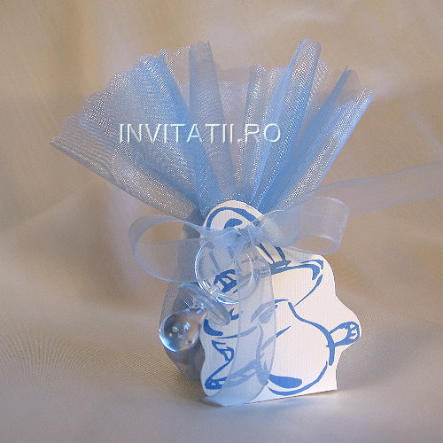 Marturie realizata dintr-un manson de carton crem mat striat cu tipar sub forma de biberon bleu, cuprinde 5 arahide glazurate prinse intr-un cerc de organza bleu, o fundita asortata si un biberon de plastic transparent.- Personalizarea este gratuita.