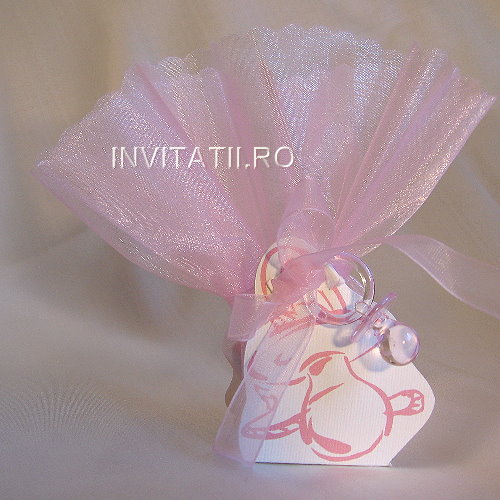Marturie realizata dintr-un manson de carton crem mat striat cu tipar sub forma de biberon roz, cuprinde 5 arahide glazurate prinse intr-un cerc de organza roz, o fundita asortata si un biberon de plastic transparent.- Personalizarea este gratuita.